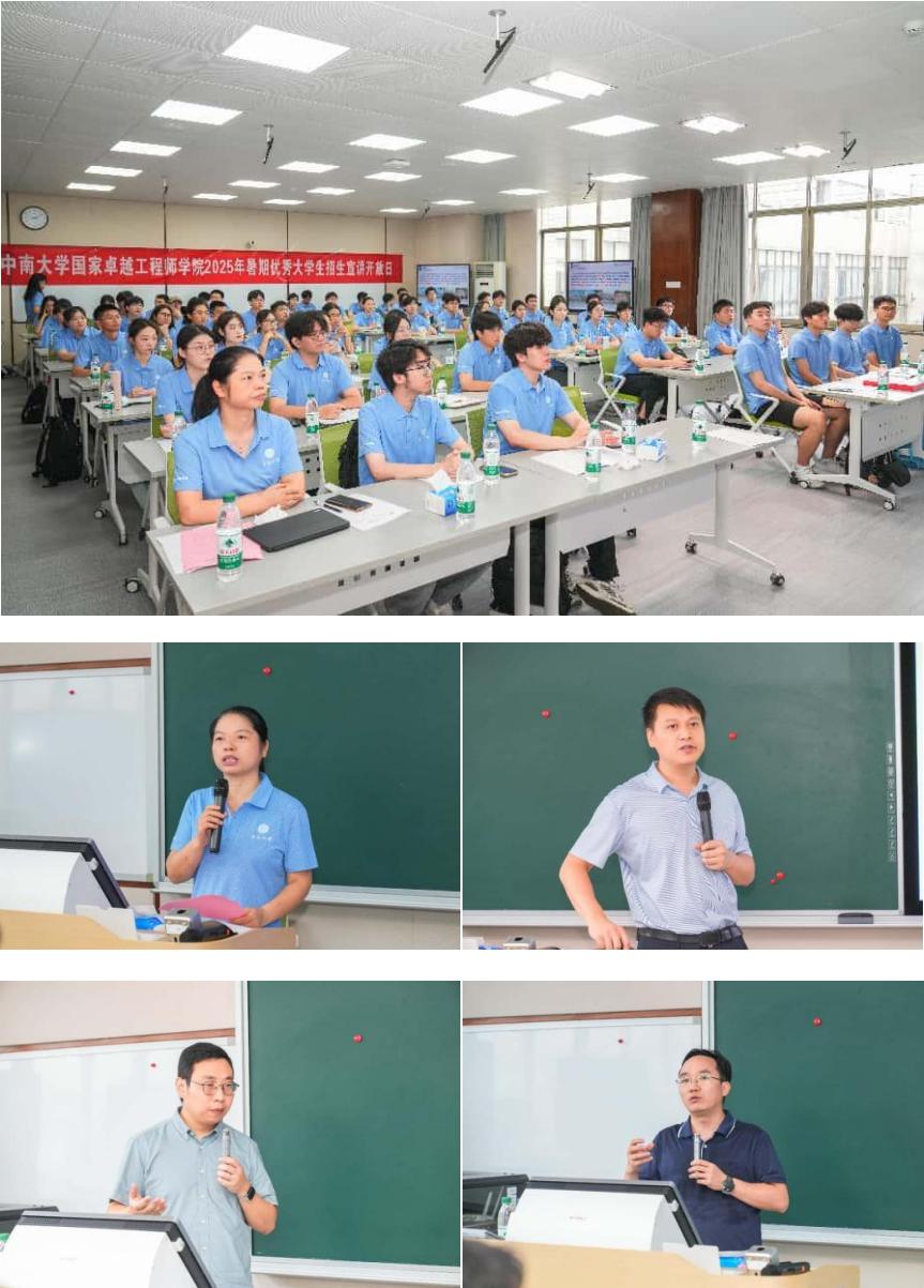7月22日上午,活动开幕式在岳麓山校区科教北楼505教室举行。学院副院长陈爱良、刘芳洋、黄科科及阳春华教授、邹应萍教授、张宗良教授等出席活动。开幕式上,陈爱良副院长以"新时代卓越工程师的使命与担当"为题致辞,勉励同学们要以"敢为人先、追求卓越"的精神,努力在工程科技领域勇攀高峰。刘芳洋副院长系统介绍了学院"面向国家战略、聚焦产业需求、深化产教融合"的办学特色,从"学科交叉平台、校企联合导师、双基地培养"三个维度解析了学院差异化育人模式。张宗良教授、黄科科副院长分别对新能源与储能学科、智能科学与技术的特色优势、科研成果及应用前景进行了详细讲解,凸显了学科交叉融合的创新活力。