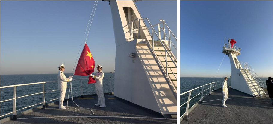 12月8日,全体人员在“东方红3”船甲板列队参加升旗仪式。晨光映照碧海,国旗随朝阳冉冉升起,在辽阔海天之间彰显着海洋强国建设的庄严使命,也为本次活动奠定了激昂奋进的基调。