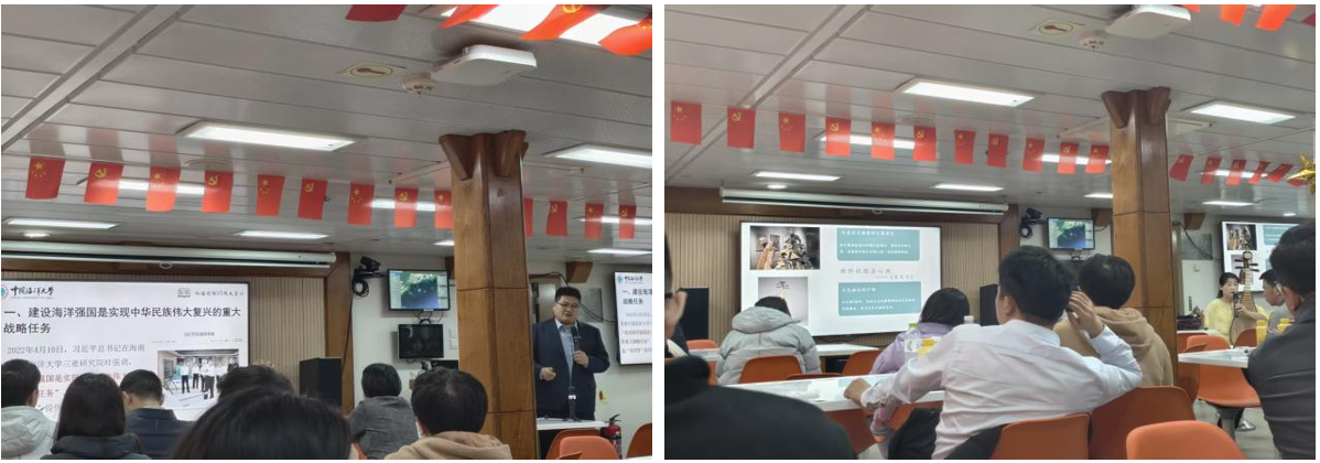 活动期间,中国海洋大学组建专业宣讲团队,开展多维度主题宣讲,实现文理知识交融。马克思主义学院党委副书记王付欣以“建设海洋强国与实现伟大复兴”为题,阐释海洋战略价值与国家发展的深层关联;艺术系副主任宁燕以琵琶演奏为切入点,从艺术视角解读海洋文化内涵;新闻中心编辑袁艺分享海洋科研工作者的鲜活案例,诠释“浩海求索丹心报国”的担当精神。